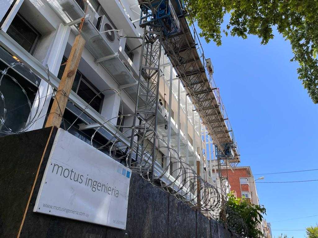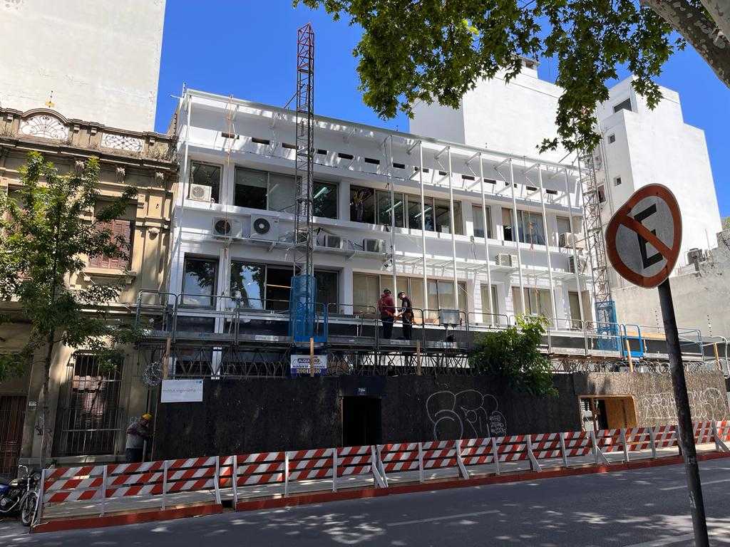 DESCRIPCIÓN: Renovación integral de la fachada principal, abarcando 210 m² e incluyendo trabajos de albañilería, sanitaria, eléctrica y aire acondicionado. Se destaca el suministro y montaje de parasoles de Hunter Douglas, con estructura metálica, que aporta una imagen renovada y contemporánea al edificio.